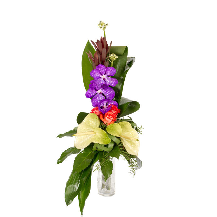 Антуриум, рози, орнитогалум, еукалиптус, леукадендрон, зеленило сатенска машна