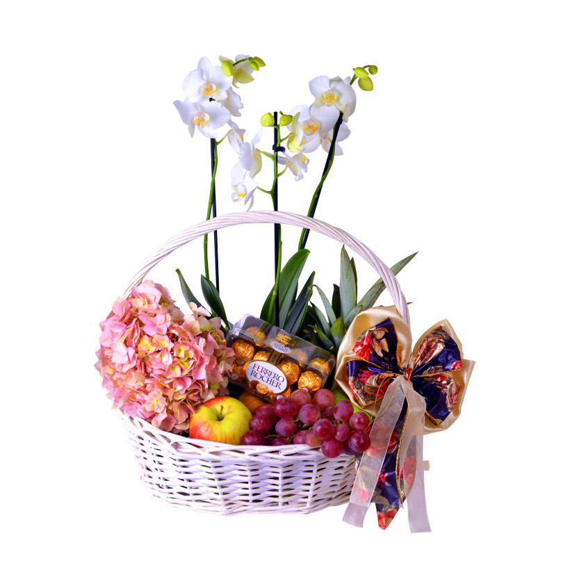 Плетена корпа,орхидеја фаленопсис во саксија,овошје,ferrero rocher бонбоњера,хортензија и сатенска машна.
