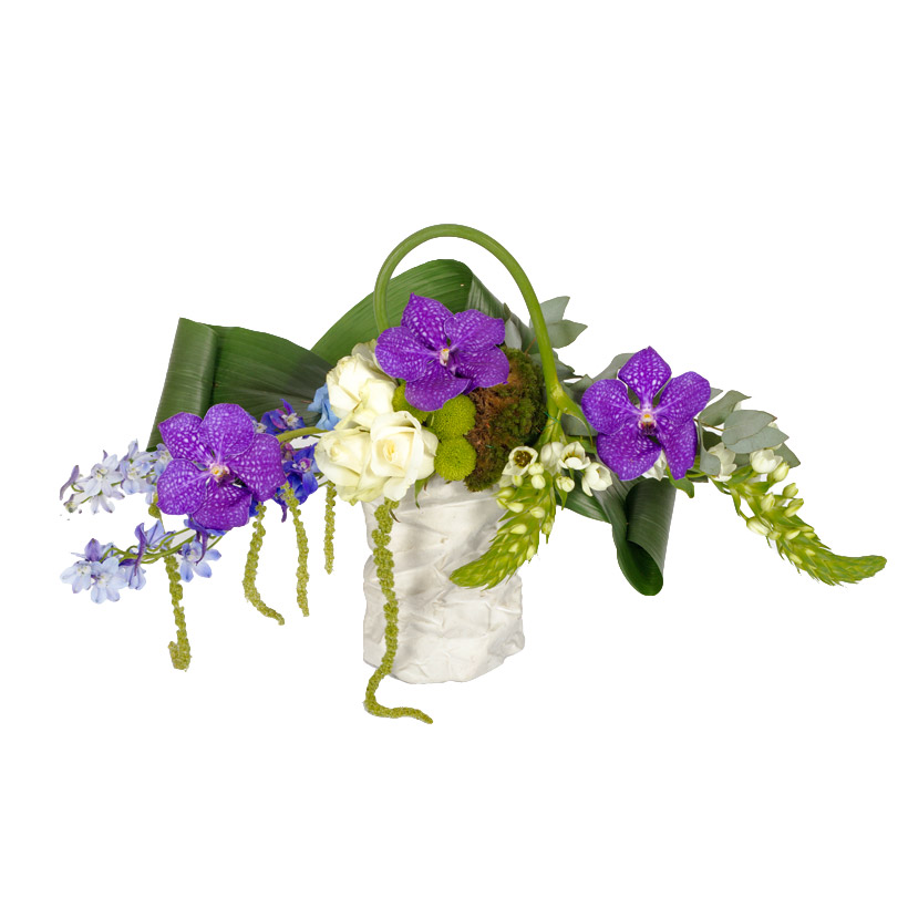 Орхидеа ванда, орнитогалум, рози, зеленило, хризантема, декоративен керамички сад
