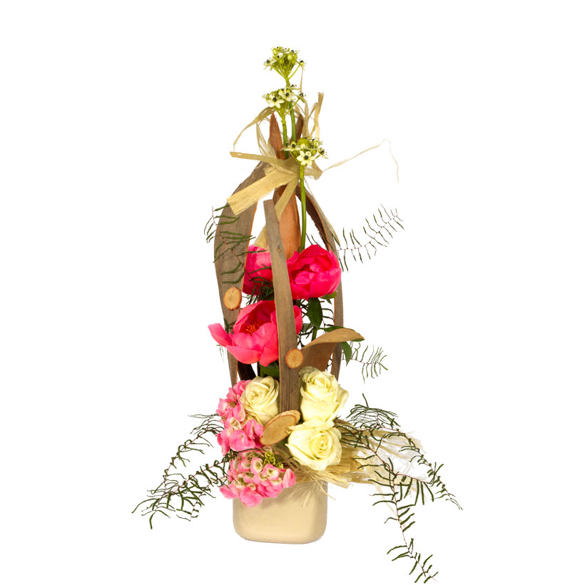 Орнитогалум, бозури, хортензија, рози, зеленило, природни кори, декоративен керамички сад