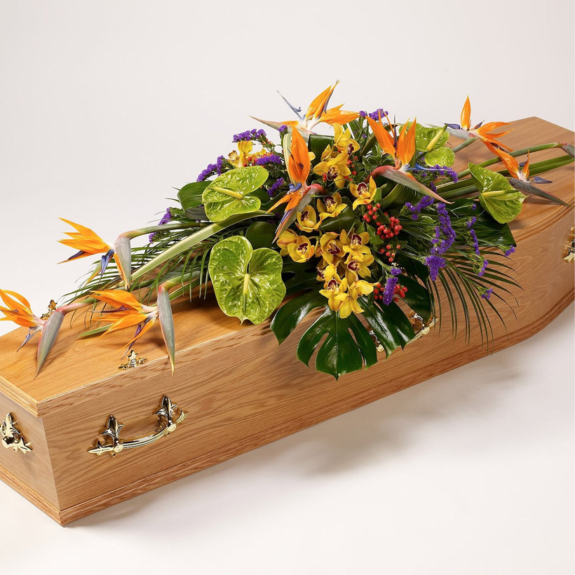 Икебана со стрелициум, антуриум, орхидеа, рози, зеленило.
