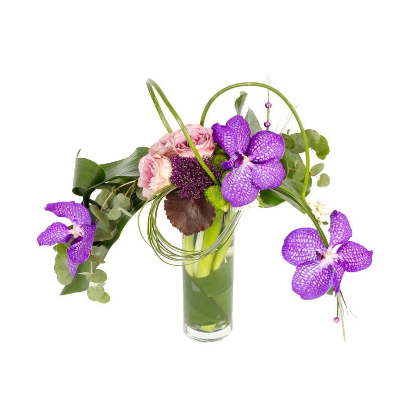 Орхидеа ванда, рози, еукалиптус, зеленило, сатенска машна