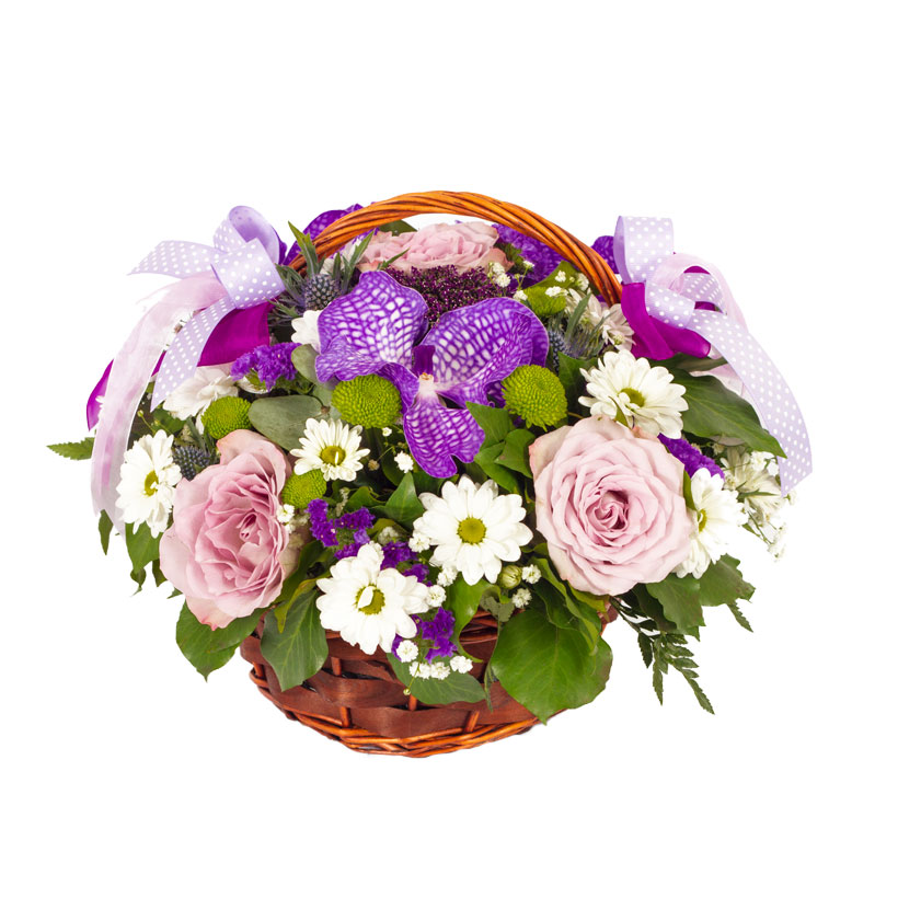 Орхидеа ванда, рози, хризантема, зеленило, свилени масни, плетена корпа
