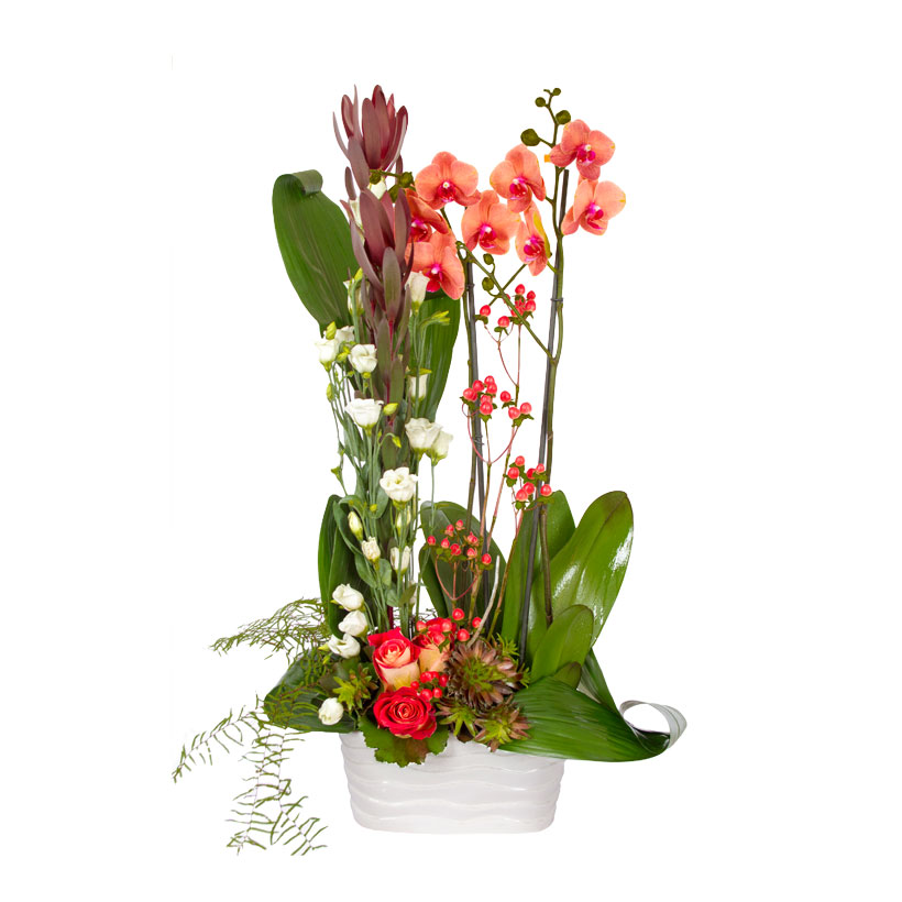 Орхидеа фаленопсис, еустома, хиперикиум, рози, сукуленти, галакс, зеленило, декоративен керамички сад