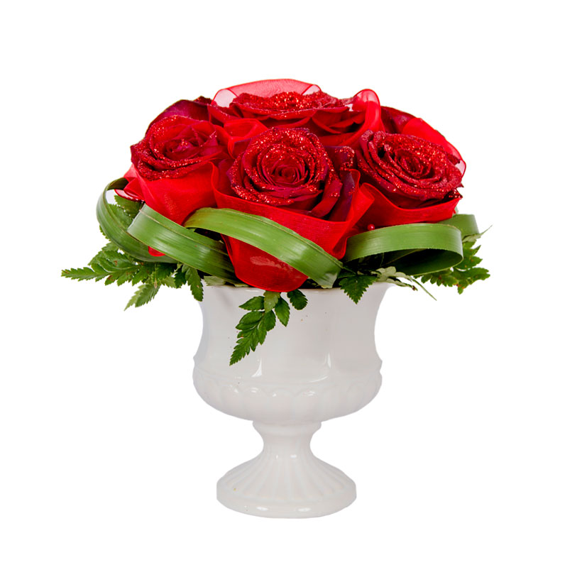 7 црвени рози, зеленило, декоративен керамички сад